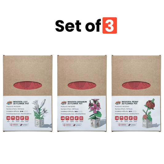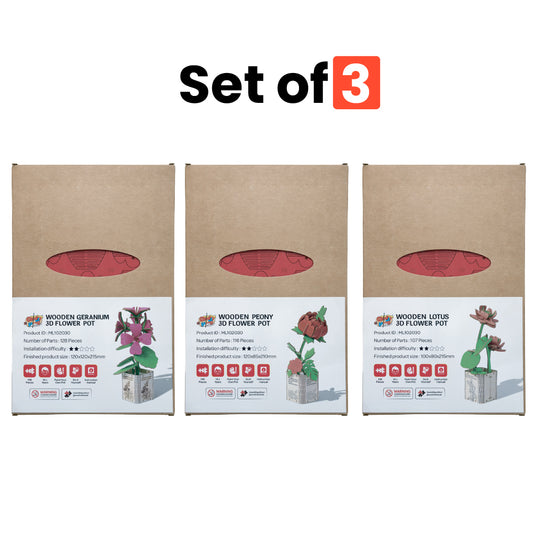 Geranium, Lotus & Peony 3D Wooden Flower Pot DIY Kit– Pack of 3