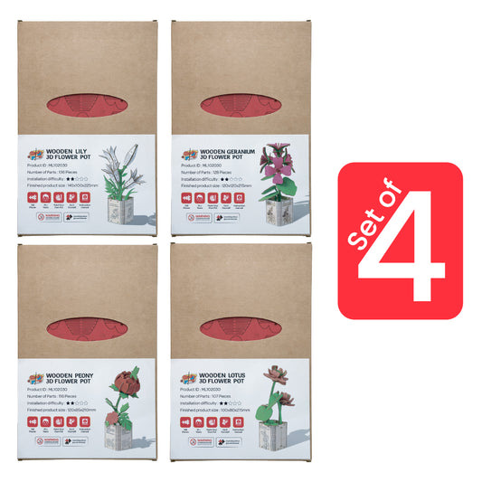 Geranium, Lily, Lotus & Peony 3D Wooden Flower Pot DIY Kit – Pack of 4